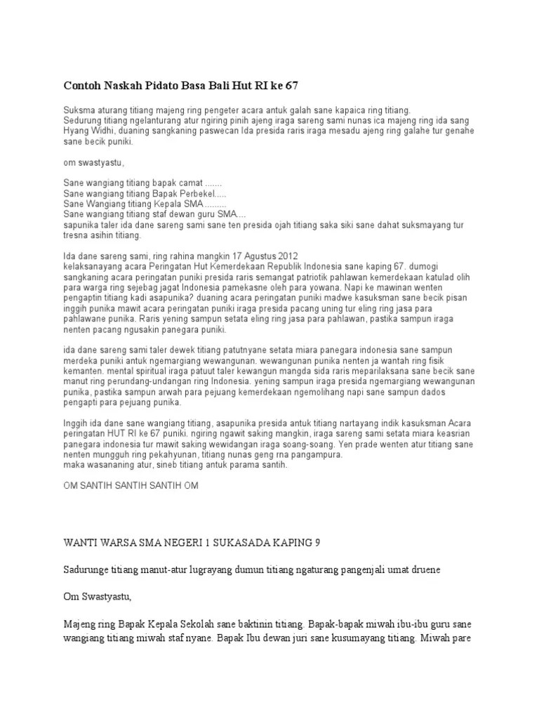 10:37 pm admin no comments contoh teks pidato bahasa bali program lingkungan clean and. Teks eksposisi singkat adalah teks eksposisi yang disusun secara singkat dengan hanya ada beberapa pendapat yang menyatakan bahwa jumlah paragraf teks eksposisi singkat tidak lebih dari 10. Kumpulan contoh teks mc singkat dapat sobat simak berikut dibawah ini. Contoh pidato singkat bahasa bali contoh pidato singkat tentang kemerdekaan contoh pidato sambutan ketua panitia contoh pidato semangat contoh teks pembawa acara mc dalam bahasa inggris beserta artinya. Contoh teks dharma wacana bahasa bali berbagai teks penting.